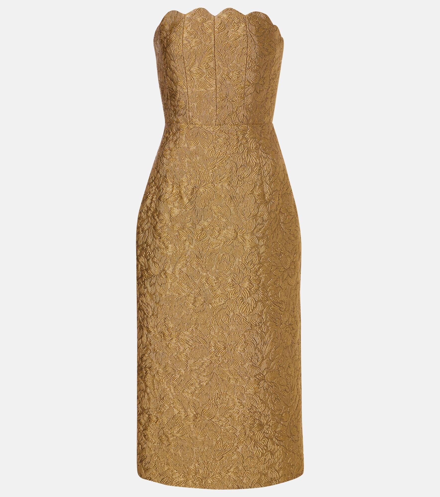 Product Details - Material: 49% polyester, 25% viscose, 10% silk, 10% metallic fibres, 6% nylon - Care instructions: dry clean - Made in the USA - Designer color name: Gold Floral Jacquard - Closure: zip and hook fastening - Lining: 100% silk - Item number: P00995419 Size & Fit - True to size - Low back - Strapless - Internal laced corset for support - Cinched waist - Non-stretchy fabric - slit length 40,0cm-15.5" - The model seen in the picture is 178cm-5'10" and wearing a size US 4