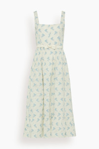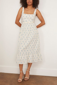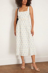 Pansy Tiered Midi Dress with Bow Belt in Ivory and Blue Floral
