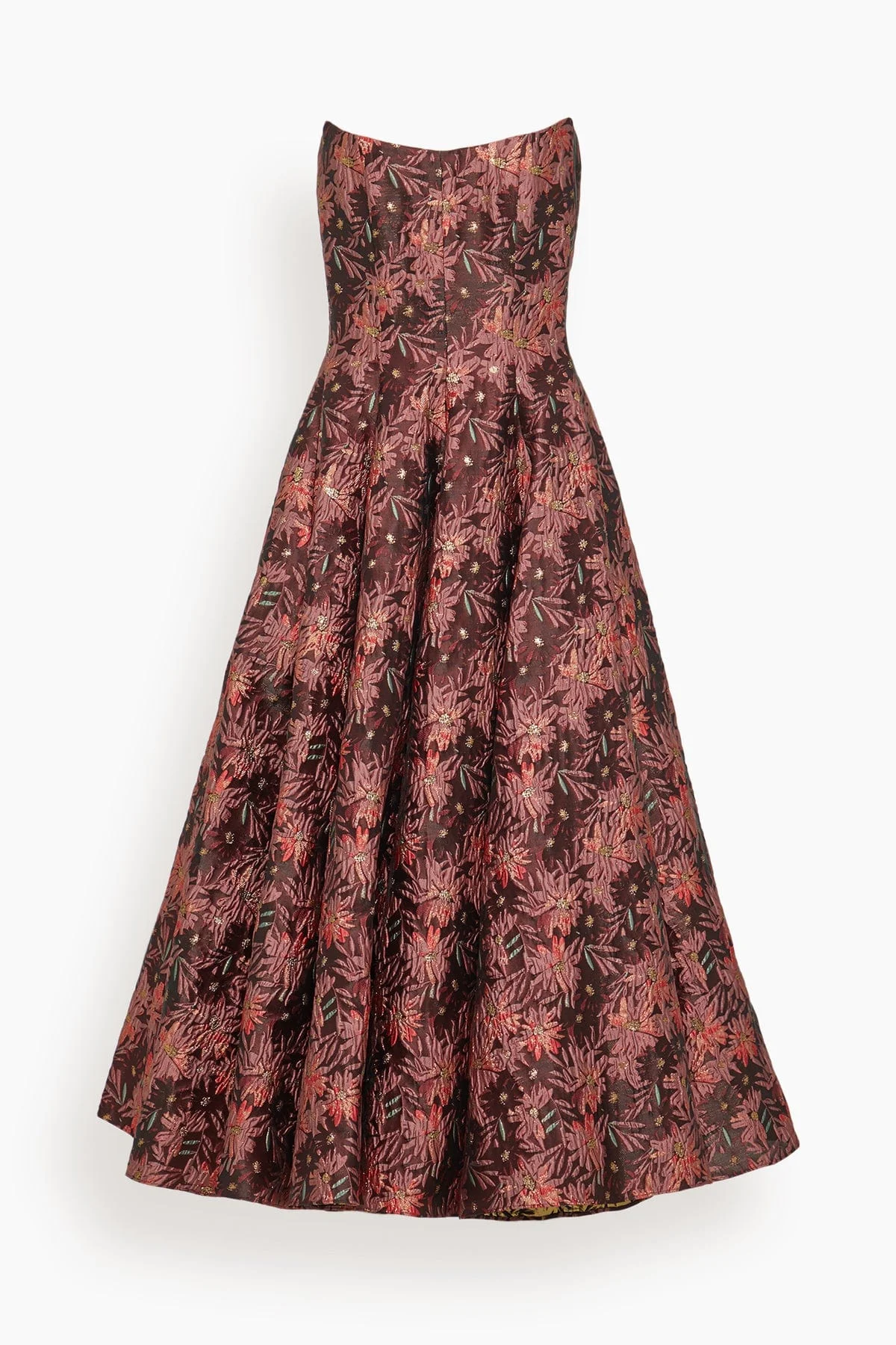 Rousseau Floral Brocade Midi Dress in Burgundy Metallic Daisy