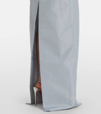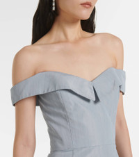 Product Details - Material: 100% polyurethane - Care instructions: dry clean - Made in the USA - Designer color name: Dusty Blue - Closure: zipped back - Lining: 100% silk - Fully lined - Item number: P00951260 Size & Fit - True to size - Off-the-shoulder - Internal boned corset for support - Cinched waist - Non-stretchy fabric - slit length 76cm-30" - The model seen in the picture is 178cm-5'10" and wearing a size US 4