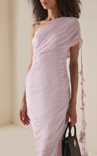 PRODUCT DETAILS - Slim fit, asymmetric neckline, draped detailing throughout, sheath silhouette with slip - Zip Closure Through Back - Lined - Composition: 100% Polyester - Color: Pink - Dry Clean Only - Resort '26