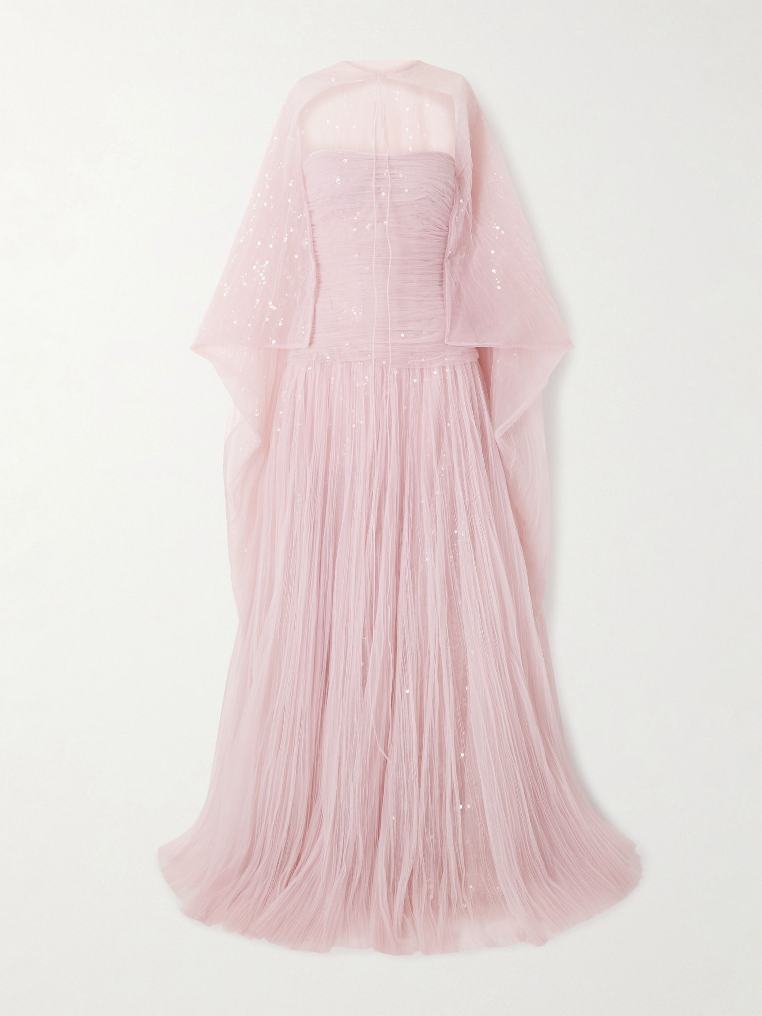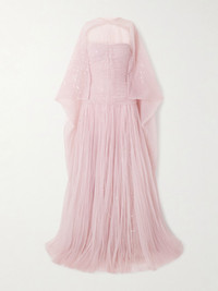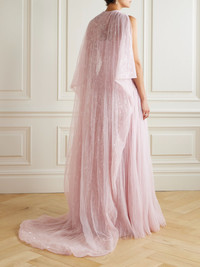 Marmar Halim’s exquisite gown is perfect for grand entrances and photo moments. It's cut from frothy plisse-chiffon saturated with light-catching sequins and fits slim through the bodice before flaring out to a voluminous skirt. The cape-effect panel cascades to a floor-sweeping hem and can be detached for a simpler look. Size & Fit - Fits small to size, take one size larger than normal - Designed to be fitted at the bust and waist, loose at the hip - Internal bust support - Mid-weight, non-stretchy fabric - Model is 177cm/ 5'10" and is wearing an EU 36 Model measurements: - Bust: 85cm/ 33.5" - Waist: 62cm/ 24.5" - Hip: 91cm/ 36" Details & Care - Pink plisse-chiffon - Concealed hook and zip fastening along back - 100% polyester