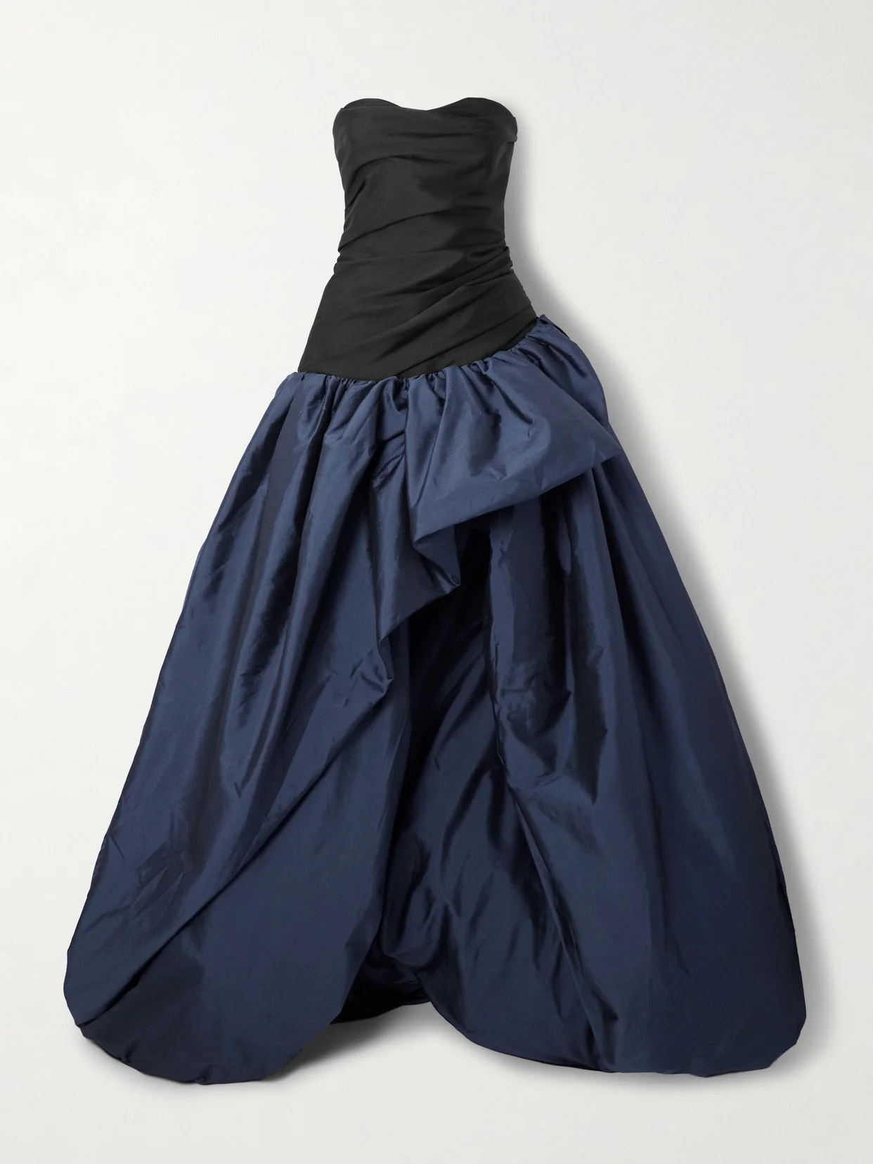 Marmar Halim is known for its exquisite sculptural silhouettes. This gown has a gathered twill bodice with boning for support and an asymmetric satin skirt with plenty of volume.