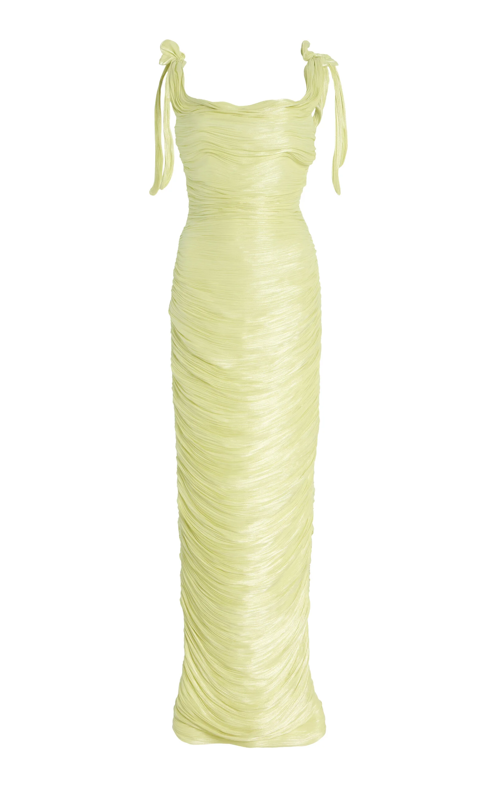 Based in Dubai, Marmar encapsulates Eastern and Western cultures, creating garments that resonate with a global audience. Each piece that MH designs is a testament to meticulous craftsmanship, ensuring each garment is a work of art. 'Roseya' is a hand-pleated draped satin-like gown with bow straps. PRODUCT DETAILS - Pre-Fall '25 - Zip fastening along back - Composition: 100% silk - Designer color: Butter Yellow - Dry clean - Imported SIZE & FIT - Our model is wearing a size EU 32 - Model is 5'10" with a 30" bust, 24" waist, and 34" hip