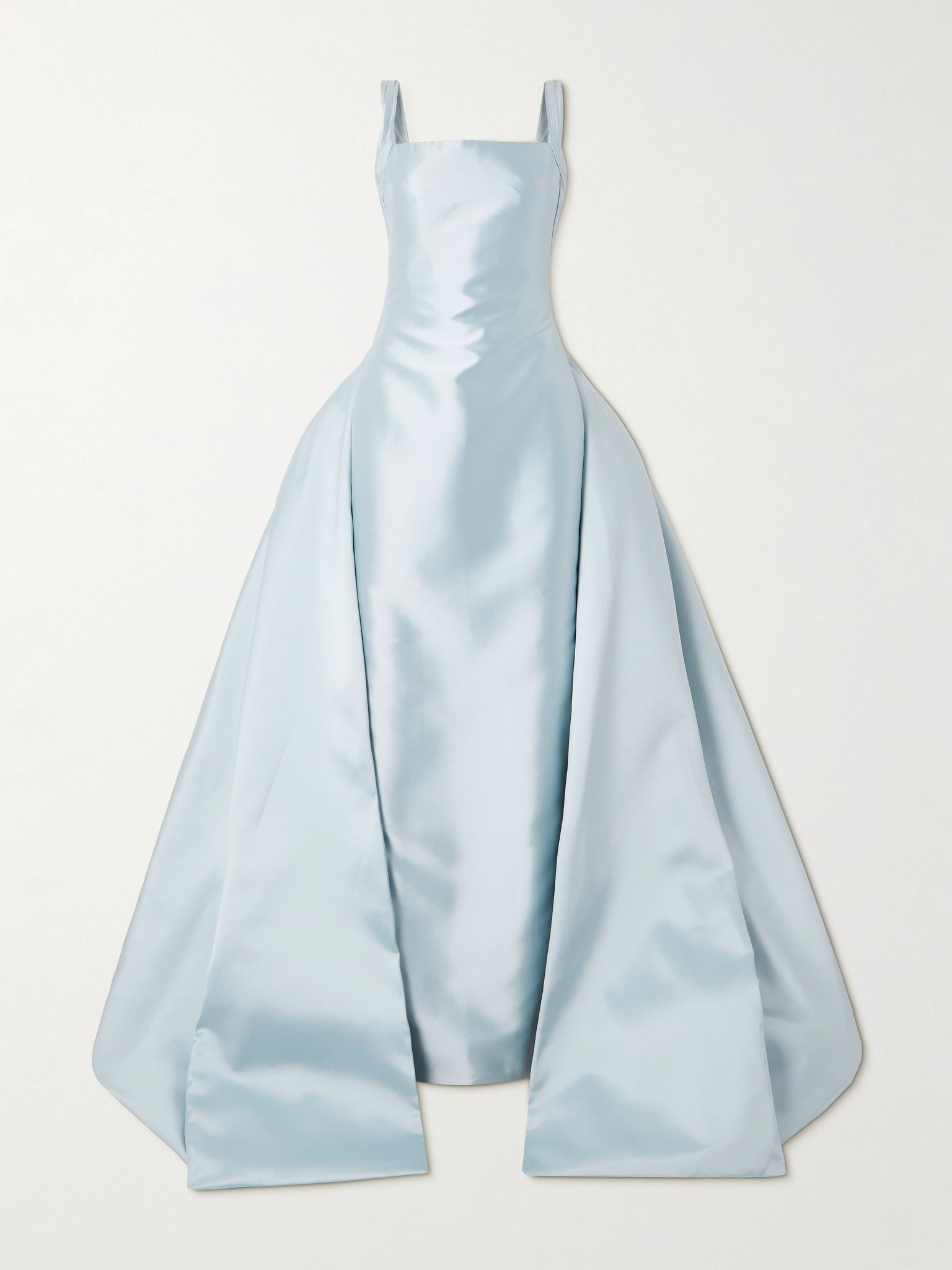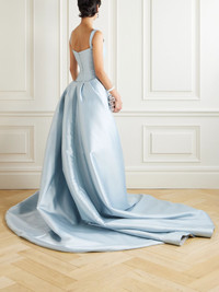 With artful detailing and sculptural lines, Marmar Halim’s visionary collections make an effortless statement. Made from gently structured faille, this gown features a voluminous detachable overskirt that holds its shape beautifully. Remove it mid-event to reveal the sleek, figure-skimming design beneath. Size & Fit - Fits true to size, take your normal size - Designed to be fitted at the bust and waist, slightly loose at the hip - Internal bust support - Intended to be worn multiple ways - Train hem - Mid-weight, non-stretchy fabric - Model is 177cm/ 5'10" and is wearing an EU 36 Model measurements: - Bust: 85cm/ 33.5" - Waist: 62cm/ 24.5" - Hip: 91cm/ 36" Details & Care - Sky-blue faille - Concealed hook and zip fastening at back - 100% polyester - Dry clean