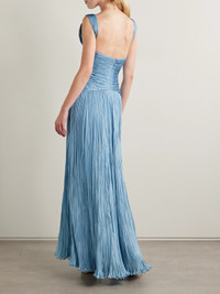Marmar Halim says its collections are "an ode to individuality, timeless artistry and ultimate femininity". This gown is made from light-blue plisse-silk that's asymmetrically wrapped around the fitted bodice and falls to a floaty skirt. A simple pendant will complement the deep V-neckline.