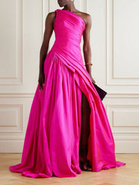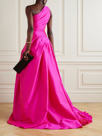 Marmar Halim's eveningwear is an homage to the designer's "rich cultural heritage" and global influences. Elegant and impactful, this one-shoulder gown is made from vibrant fuchsia taffeta that's ruched through the fitted bodice and pleated at the voluminous skirt, creating sculptural asymmetry. Small to size. See Size & Fit notes. Size & Fit - Fits small to size, take one size larger than normal - Designed to be fitted at the bust and waist, loose at the hip - Internal bust support - Lightweight, non-stretchy fabric - Model is 177cm/ 5'10", normally wears an EU 34 and is wearing an EU 36 Model measurements: - Bust: 80cm/ 31.5" - Waist: 60cm/ 23.5" - Hip: 89cm/ 35" Details & Care - Fuchsia taffeta - Concealed zip fastening along back - 100% polyester - Dry clean