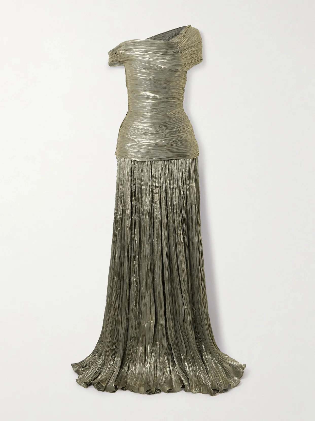 Marmar Halim's collections are celebrated for their artful craftsmanship and enchanting silhouettes. This sculpting gown is made from metallic plisse-chiffon and has a one-shoulder neckline and a dropped waist, which flows into a sweeping skirt.