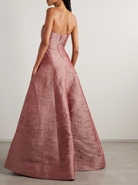 Marmar Halim's gown pairs a sleek, fitted bodice with a sweeping voluminous skirt, creating a silhouette that's both dramatic and perfectly balanced. It's made from lustrous plisse-taffeta and has internal boning for support. The reinforced hem holds its shape beautifully.