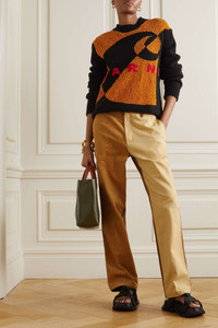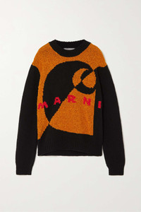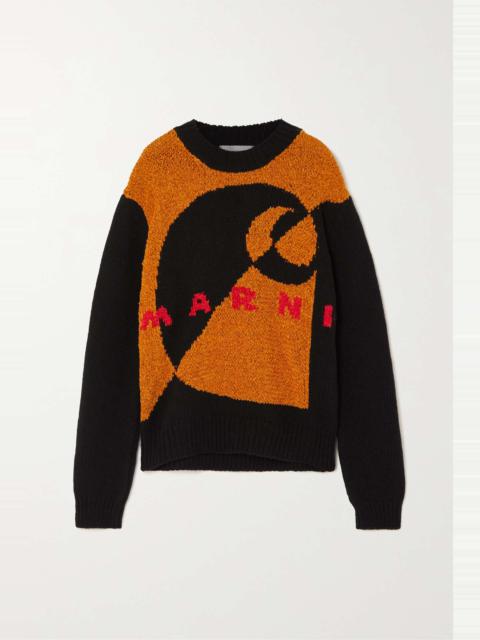 EDITORS'NOTES Marni's Spring '23 collaboration with Carhartt WIP celebrates both brands' distinctive identities. Jacquard-knitted in Italy from luxuriously soft chenille, this sweater has a slightly loose fit and playful design featuring the labels' monikers. Wear yours with the color-block pants from the collection. SIZE & FIT - Fits true to size, take your normal size - Designed for a slightly loose fit - Mid-weight knit - Model is 180cm/ 5’11” and is wearing an IT 40 DETAILS & CARE - Multicolored chenille-jacquard - Slips on - Fabric1: 95% wool, 5% silk; fabric2: 100% cotton - Dry clean