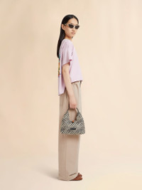 Trapeze bag made from raffia-effect fabric with a two-tone wavy pattern. Sleek, compact silhouette with leather top handle. Colorful cabochon and loop closure. Cotton lining and inside leather pocket. Embellished with a leather Marni patch on the front. Made in Italy MODEL BMMP0171U1P984100N99