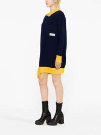 asymmetric raw-edge ribbed jumper This jumper from Marni arrives in a knitted construction adorned with the brand's logo for a distinctive feel. Highlights - Navy blue/mustard yellow - Virgin wool blend - Ribbed knit - Asymmetric design - Logo patch at the chest - Pointed flat collar - Drop shoulder - Long sleeves - Asymmetric hem Made in Italy Composition Virgin Wool 70%, Cotton 30% SIZE & FIT Model measurements Height 5 ft 10 in(1.79 m) Bust/Chest 31.49 in(80 cm) Hips 35.03 in(89 cm) Waist 23.62 in(60 cm) FittingInformation Designed to be unstructured, offering a loose fit throughout Made with a midweight knit, this piece offers some stretch This piece fits true to size – take your usual size Washing instructions Dry Clean Only
