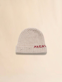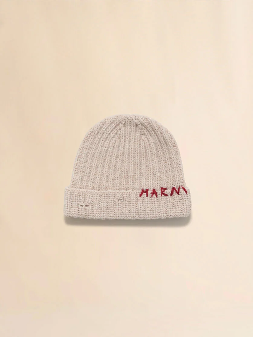 Fisherman rib beanie knitted from Shetland wool. Hand-stitched Marni Mending logo securing the turn-up. Made in Italy MODEL CLMC0125Q0UFH93800W32 COMPOSITION 100% WVK