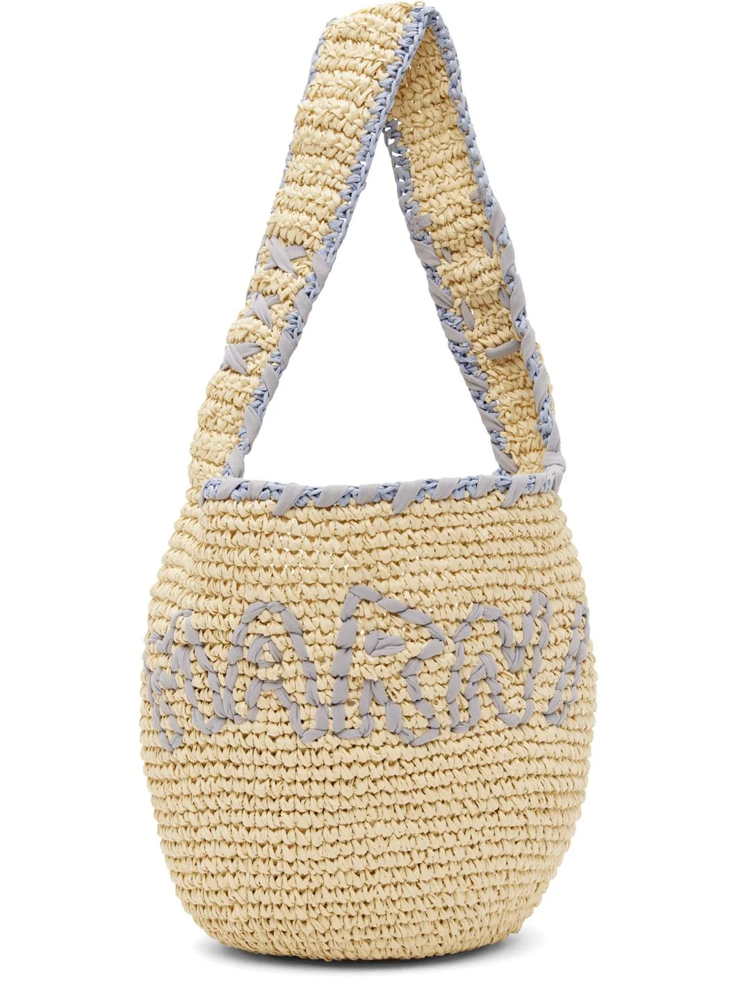 Woven shoulder bag. · Whipstitching at shoulder strap · Logo embroidered at face · Contrast stitching in blue · H17" x W19" x D7" Supplier color: Natural/Light blue Textile. Made in India 252379F046002
