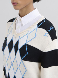 Cotton knitted sweated with a classic argyle motif on the front. The regular silhouette has long sleeves, a V neckline. Ribbed knit trims and a Marni Symbol hand embroidered on the left shoulder. The main fiber in this garment is made using at least 50% of highly selected organic cotton, grown using farming practices that support biodiversity and healthy ecosystems. Made in Italy MODEL CVMD0151Q0UFC657ARN99 FIT The model is 5' 9''. The model is wearing size 40 IT. COMPOSITION Primary Fabric: 100% Cotton Knit - Secondary Fabric: 100% Cotton Knit - Third Fabric: 100% Cotton Knit
