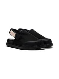 Buffed leather and moire mules in black. · Logo patch at velcro slingback strap · Logo embossed molded leather footbed · Treaded rubber sole with jute detailing Supplier color: Black Upper: leather, textile. Sole: rubber, textile. Made in Italy 241379F121006