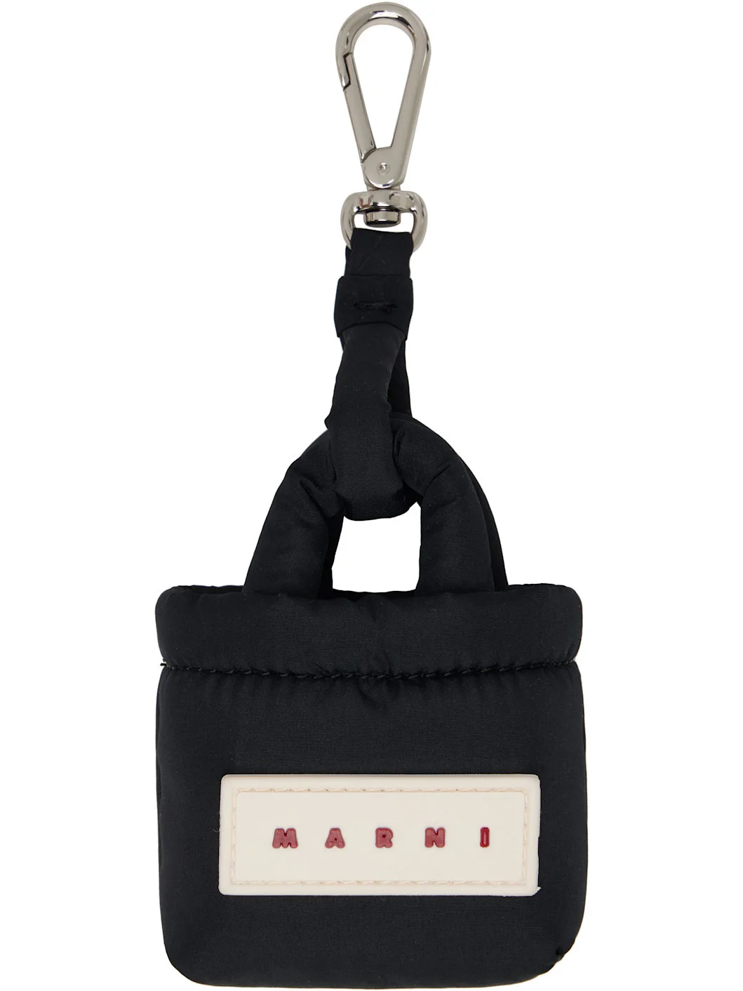 Padded taffeta keychain. · Graphic charm with rubberized logo patch · Open throat at charm · Logo-engraved lanyard clasp · Charm: H4.5" x W3" x D1" Supplier color: Black Textile. Made in Italy 261379F025002