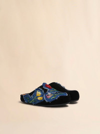 BLACK CORDUROY FUSSBETT SABOT WITH DENIM APPLIQUÉS