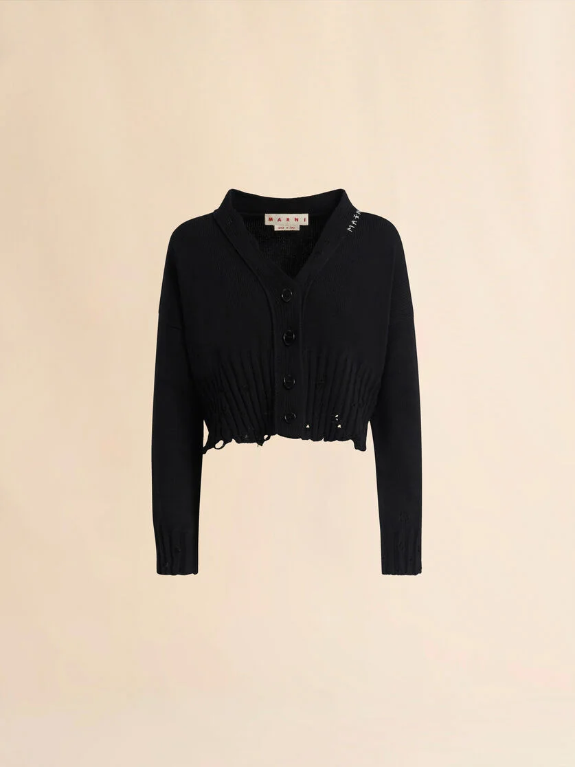 Cropped cardigan. Long-sleeved. V-neck. Horn button closure. Boxy fit. Front hand embroidered logo. Made in Italy MODEL CDMD0223A2UFC65200N99 COMPOSITION Primary Fabric: 100% Cotton Knit