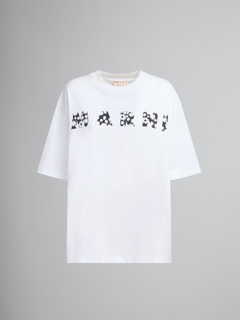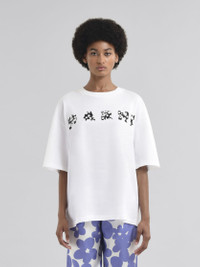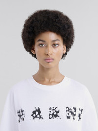 Boxy cut soft jersey cotton T-shirt with crew neck and short sleeves. Marni lettering in the Pop Fields pattern printed on the front. Made in Italy MODEL THJET49P15USCX50FLW01 FIT The model is 5' 9''. The model is wearing size 40 IT. COMPOSITION Primary Fabric: 100% Cotton Knit