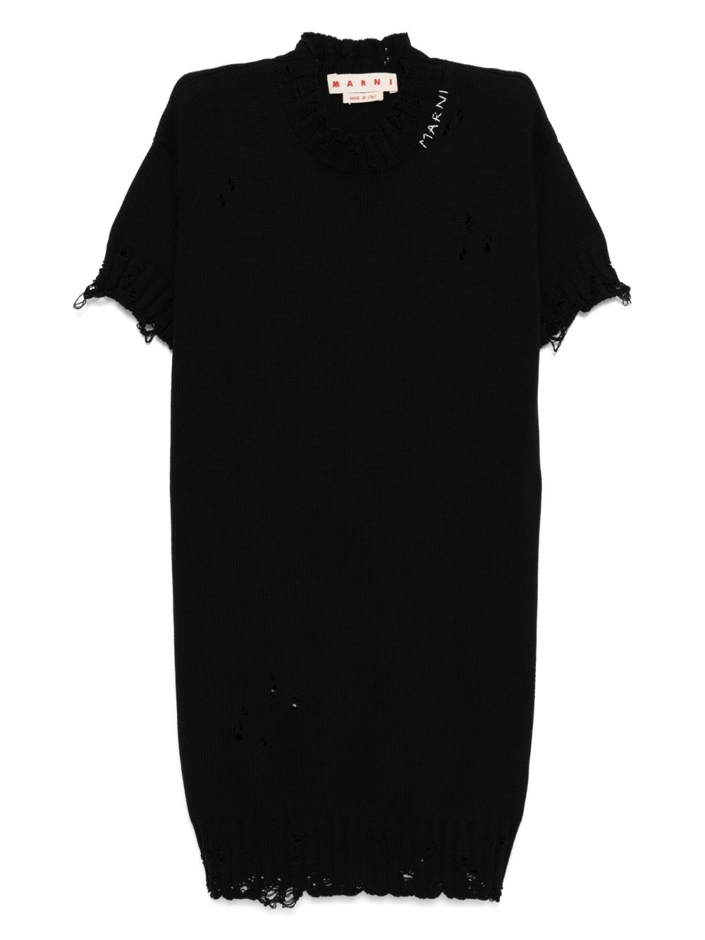 FINAL SALE The Disheveled Cotton Mini Dress in Black by Marni is a mini length, knit dress featuring ribbed finishes, stitched Marni logo, and distressed details. - 100% Cotton