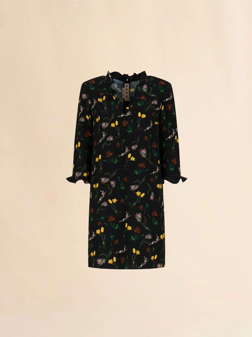 Envers satin dress, printed with a delicate motif of tulips and jumping hares. 3/4-sleeve mini cut with ruffles at the neck and cuffs. Concealed back zipper closure. Made in Italy MODEL ABMA1473A0UTVA52THN99 COMPOSITION Primary Fabric: 100% Viscose-Rayon Woven - Lining: 60% Cupro Woven 40% Silk Woven