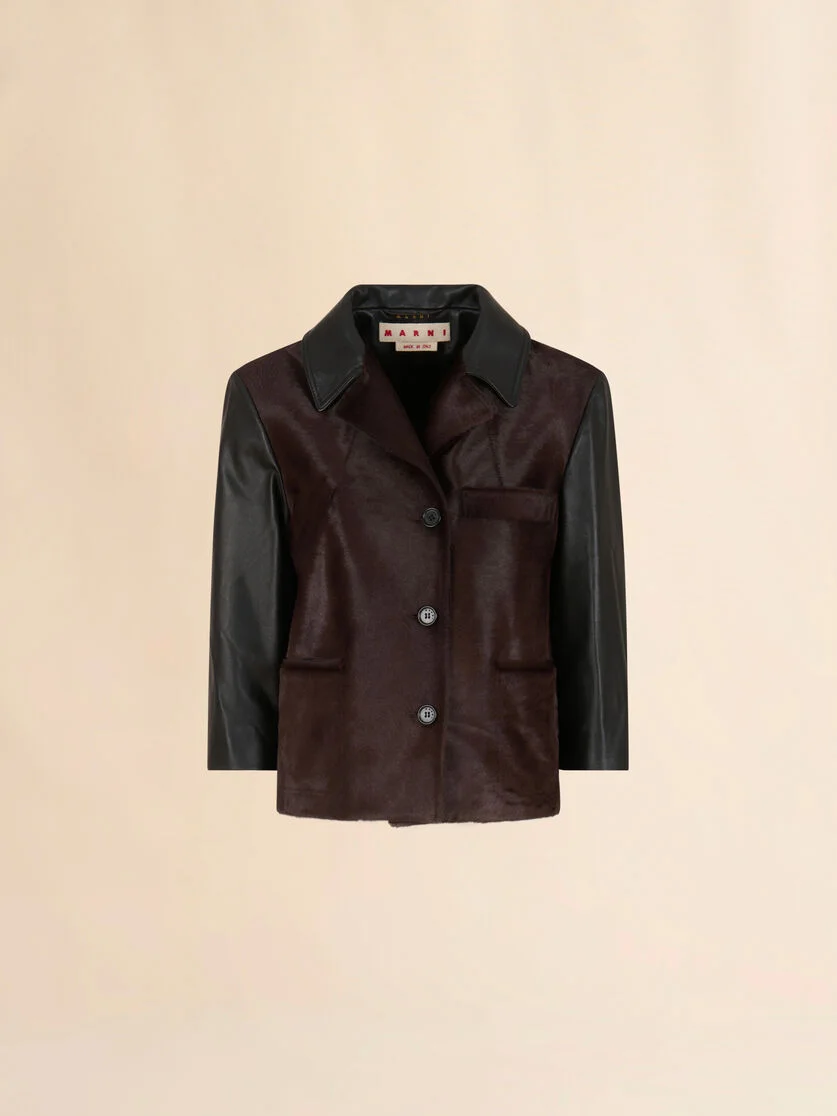 Single-breasted leather jacket with soft pony hair front. Boxy fit with button fastening, welt chest pocket and two patch pockets. Finished with a lapel collar and three-quarter length sleeves. Fully lined. Made in Italy MODEL GIMX0129M3ULV88400M99