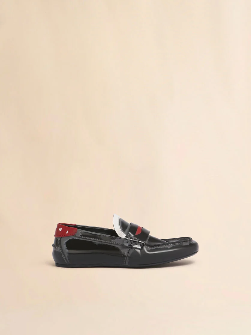 Flat moccasin made from supple leather with removable brushed finish. Detailed with contrast slit on penny strap and heel tab with screen-printed Marni logo. Hand-stitched vamp. Leather lining, Fussbett insole and leather sole. Made in Italy MODEL MOMS006600P4979ZP012