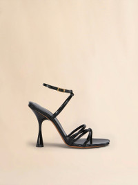 Moonlight sandal with slim straps, made of brushed calf leather. Featuring a sculpted toe and glossy lacquered 100mm heel. Criss cross ankle strap with small side buckle. Nappa leather lining with Marni logo on the sole. Leather sole. Made in Italy MODEL SAMS022710PS67900N99 COMPOSITION Upper: 100% Calf Leather - Inside: 100% Goat Leather - Sole: 100% Calf Leather