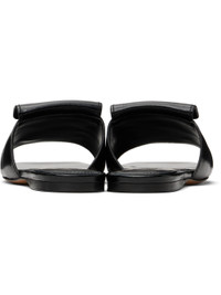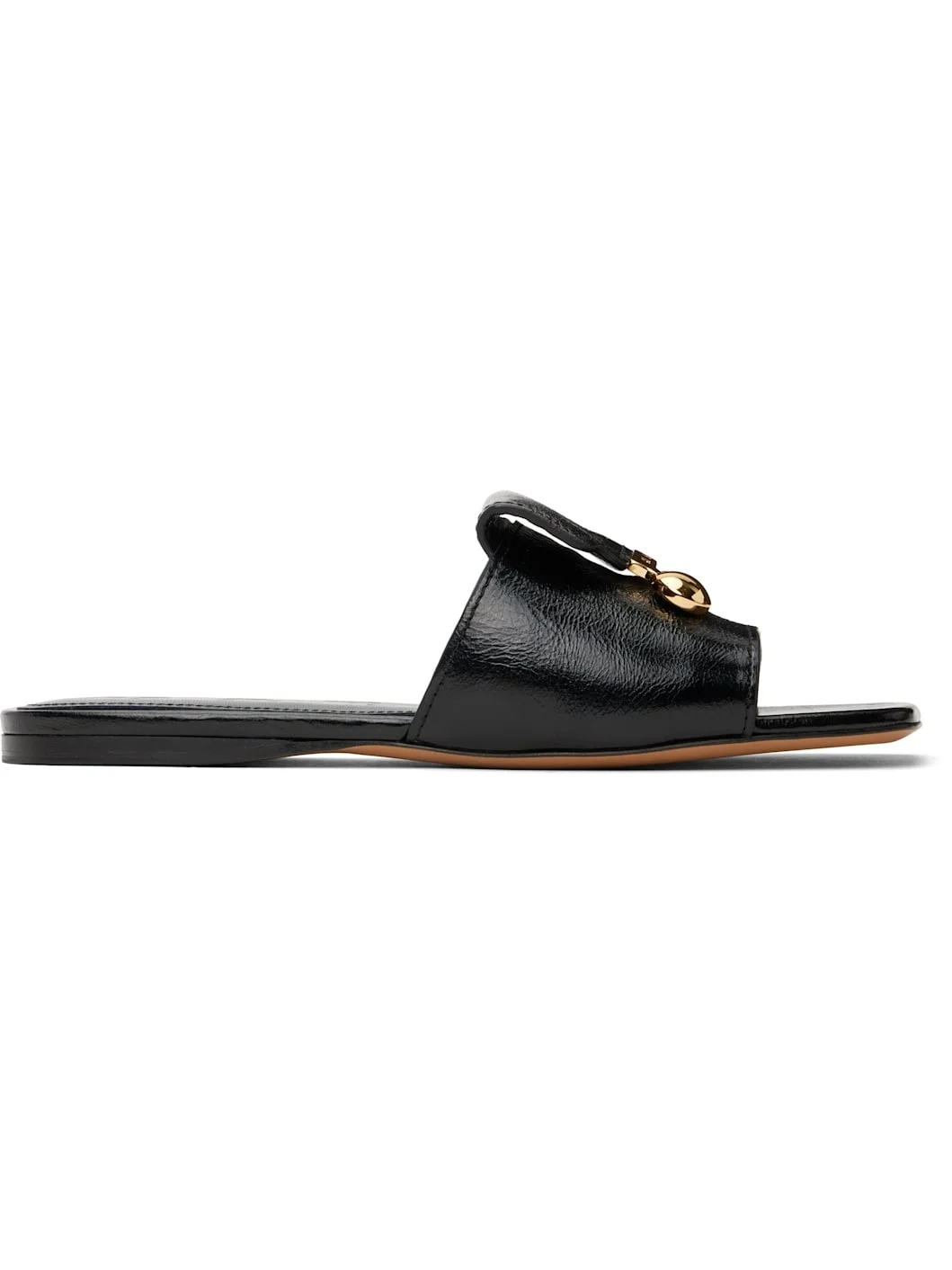 Crinkled patent calfskin flat sandals in black. · Open square toe · Logo-engraved hardware at vamp · Polished calfskin sole with rubber injection Supplier color: Black Upper: calfskin. Sole: calfskin, rubber. Made in Italy 251379F124003