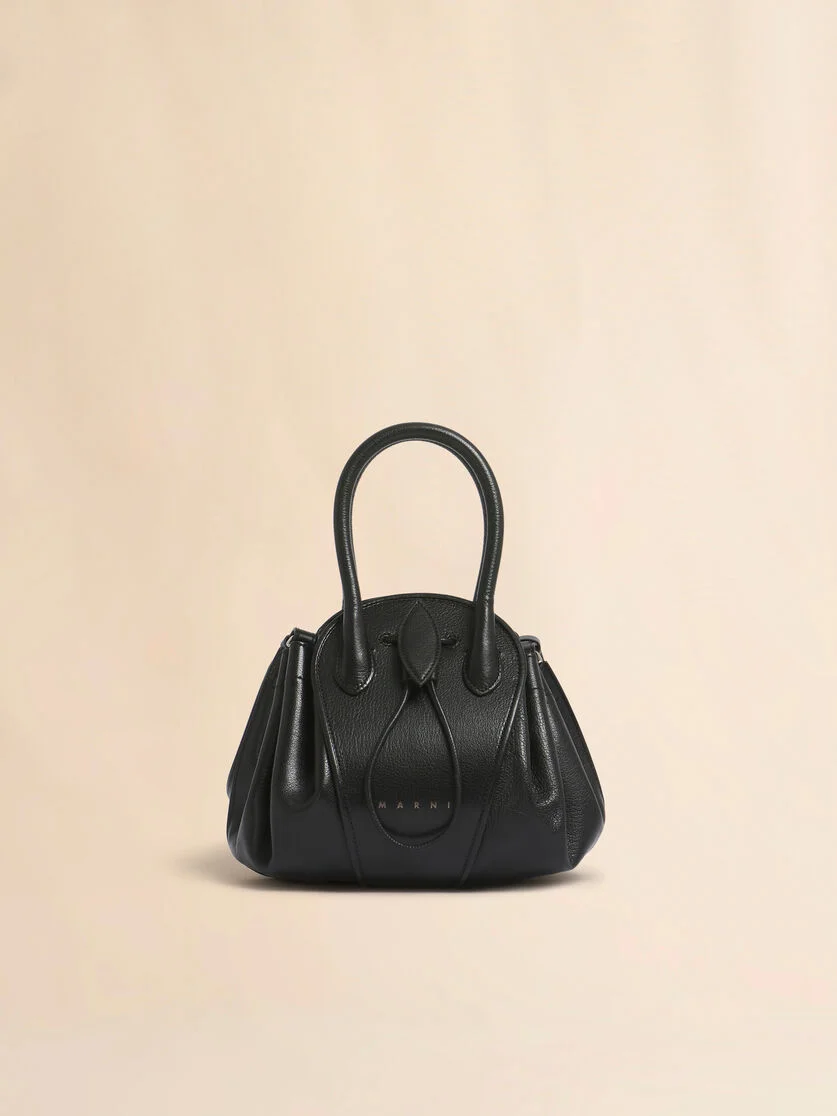Tulipea small bag made from supple buffalo leather with natural veining and an uneven texture that renders every piece unique. Crafted with a rigid central body and flexible unlined bellows shape at the sides evoking the delicate opening of a bud. Tubular top handles and detachable shoulder strap with D-rings and studs. Hot-stamped silver Marni logo on the front. Drawstring fastening and soft faux suede lining. Made in Italy MODEL SBMP0223A0P871000N99