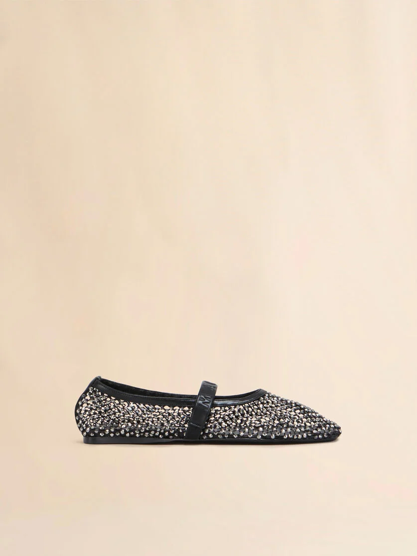 Mesh Mary Jane ballet shoe, encrusted with rhinestones. Square toe. Leather strap, detailed with embossed Marni lettering. Comes with a bag of replacement rhinestones. Made in Italy MODEL MJMS007700P639400N99 COMPOSITION Upper: 98% Polyester 2% Elastane-Spandex - Contrast: 100% Glass - Contrast: 100% Calf Leather - Inside: 100% Ovine Leather - Sole: 100% Calf Leather