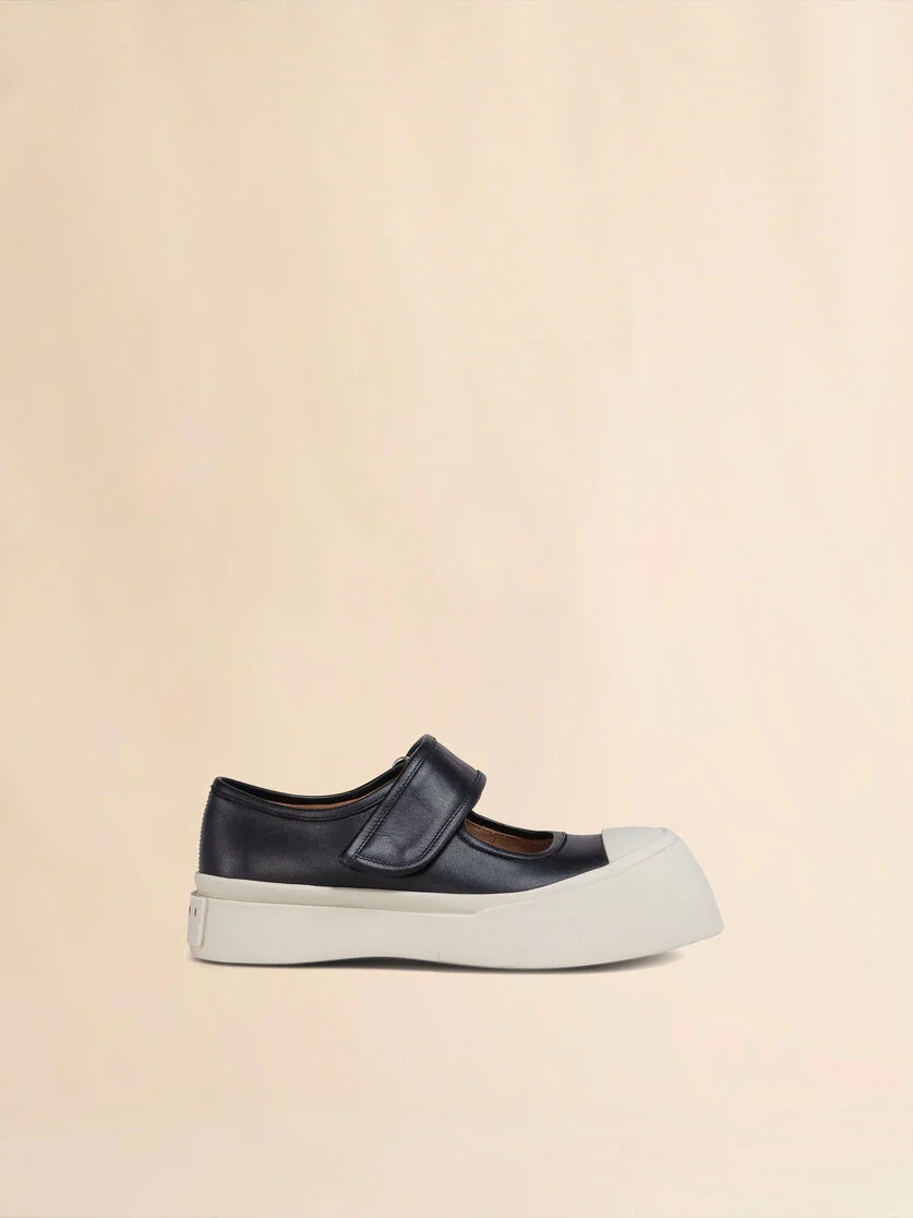 Pablo Mary Jane sneaker in nappa leather with strap. Leather lining. Soft leather insole. Chunky platform sole in rubber with Marni logo on the back. Made in Italy MODEL SNZW003120P272200N99 COMPOSITION Upper: 100% Calf Leather - Lining: 100% Ovine Leather - Inside: 100% Ovine Leather - Sole: 100% Rubber CARE INSTRUCTION Do not wash. Do not bleach. Do not iron. Do not dry clean. Do not tumble dry. Do not professionally wet clean.