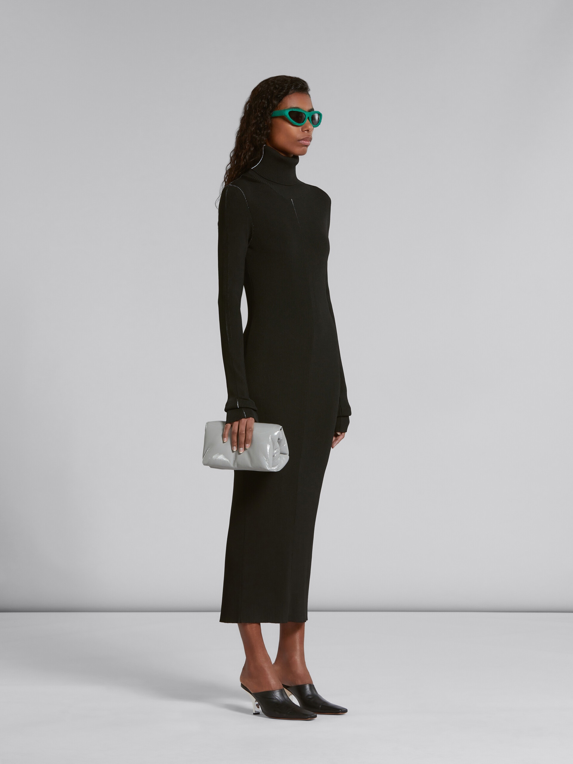 Stretch-rib dress knitted from a viscose blend. Slim fit, with turtle neck, extra-long sleeves and a back slit. Made in Italy.