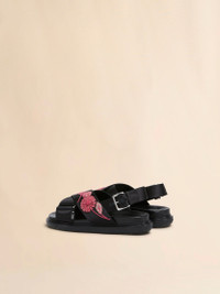 Iconic crisscross Fussbett sandal crafted from satin with delicately embroidered flower patches, fastening with an adjustable buckle strap. Monocolour design with tonal leather insole and rubber outsole. Raised Marni lettering on the heel. Made in Italy MODEL FBMS015701P853400N99 COMPOSITION Upper: 72% Viscose-Rayon 28% Silk - Lining: 100% Ovine Leather - Inside: 100% Ovine Leather - Sole: 100% Rubber