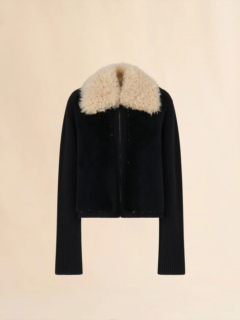 Ribbed jacket knitted from virgin wool. Tonal shearling patches on the front, edged with hand-embroidered Marni Mending. Contrast curly shearling collar. Regular fit with zipper closure. Hand-embroidered Marni Mending logo on the back. Made in Italy MODEL GIMD0025NQUFWH2700N99