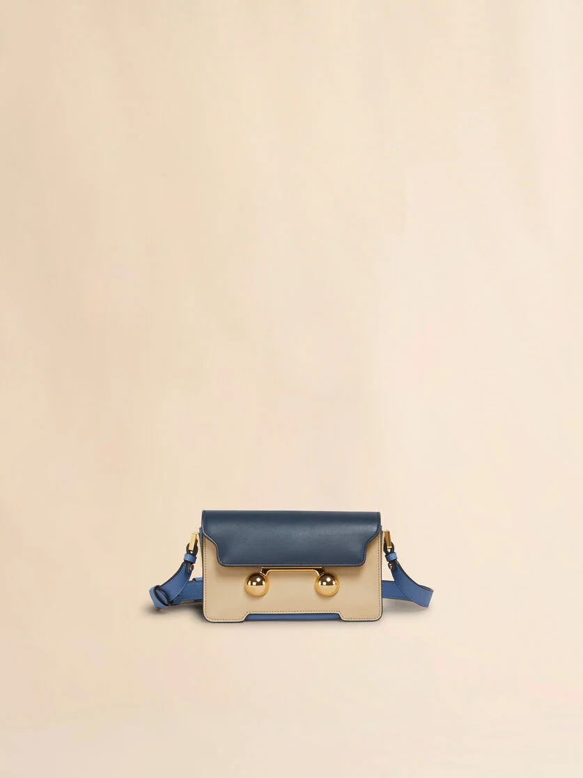 Trunkaroo rectangular mini shoulder bag crafted from calfskin leather. Colour block design. Front flap with magnetic closure, featuring engraved Marni lettering and oversized stud details. Contoured base on the front and back. One compartment with inside pocket. Lined in nappa leather. Detachable and adjustable buckled shoulder strap: can also be worn as a clutch. This product is made using leather from a Leather Working Group medalled tannery. LWG supports more responsible leather manufacturing across the globe. Made in Italy MODEL SBMP0193U1P6948ZO877 COMPOSITION Body: 100% Calf Leather - Lining: 100% Ovine Leather - Metallic Parts: 100% Brass - Metallic Parts: 100% Steel