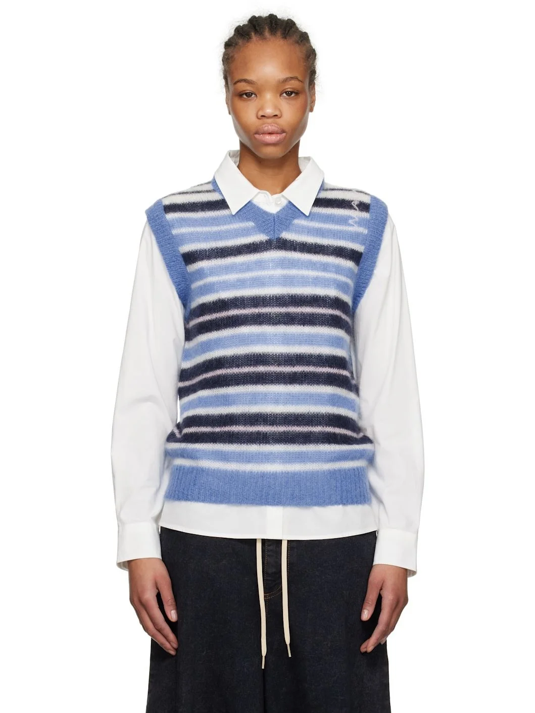 Lightweight brushed knit mohair-blend vest. · Jacquard stripes throughout · Rib-knit V-neck, hem, and cuffs · Hand-stitched logo at shoulder Supplier color: Blue/Lilac 67% mohair, 28% polyamide, 5% wool. Made in Italy 251379F100002