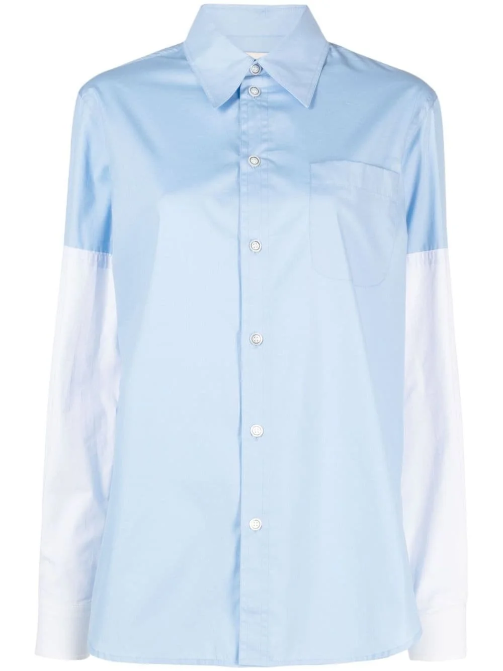 long-sleeve cotton shirt Highlights - Blue/white - Cotton - Spread collar - Contrast stitching - Chest patch pocket - Front button fastening - Enamel buttons - Long sleeves - Buttoned-cuff sleeves - Curved hem Made in Italy Composition Cotton 100% SIZE & FIT Model measurements Height 5 ft 10 in(1.78 m) Bust/Chest 33.07 in(84 cm) Hips 36.61 in(93 cm) Waist 24.8 in(63 cm) FittingInformation Designed to be unstructured, offering a loose fit throughout Made from a midweight non-stretch fabric This piece fits true to size – take your usual size Washing instructions Hand Wash