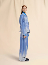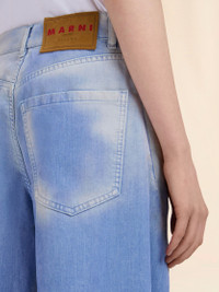 Five-pocket jeans made from flocked denim, garment-dyed and bleached to create a degrade effect. Cut with a low rise and wide leg, featuring an external seam that twists round to the front. Leather Marni patch on the back waist. Part of the Artists' Wardrobe: a selection spanning statement pieces and everyday essentials, drawing inspiration from the works of artists Slawn and Soldier. Made in Italy MODEL PAJD0592A0USCY2400B50
