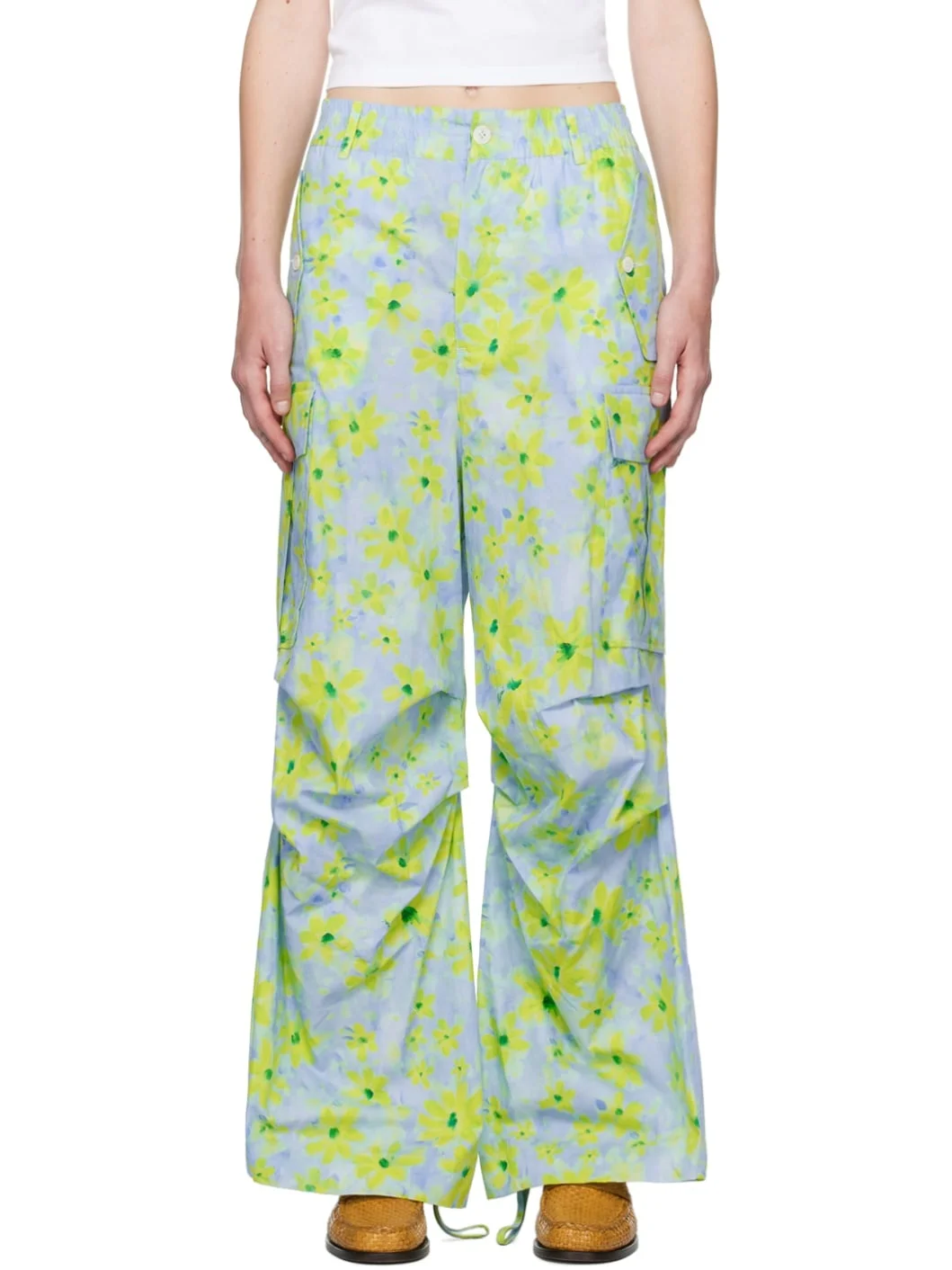 Loose-fit cotton poplin cargo pants. Logo and floral pattern printed throughout. · Belt loops · Concealed drawstring a elasticized waistband · Four-pocket styling · Zip-fly · Tucks at knees · Drawstring at cuffs · Cargo pocket at outseams Supplier color: Aquamarine 100% cotton. Made in Italy 241379F087006