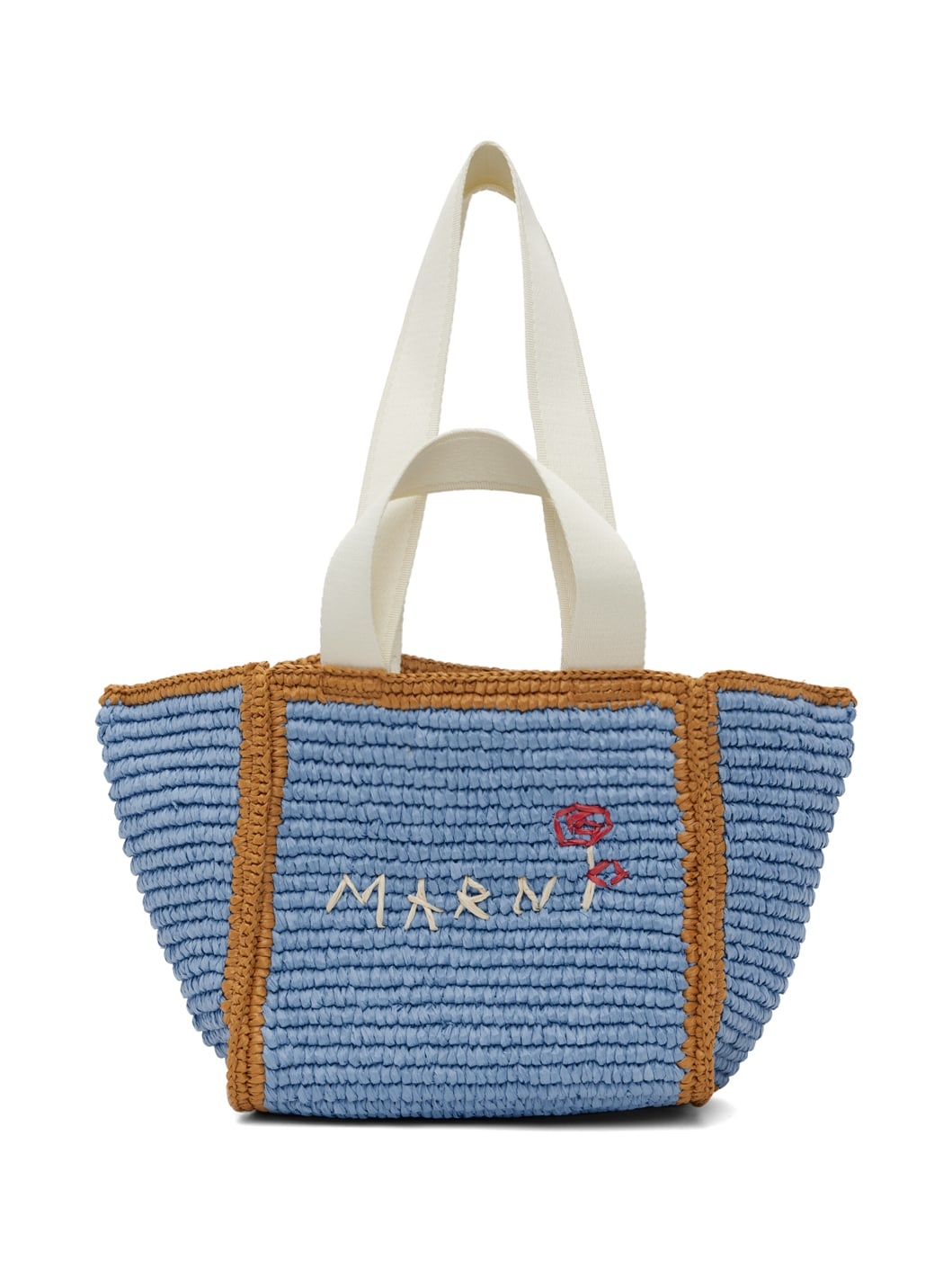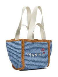 Woven raffia tote in blue. · Twin webbing carry handles · Twin webbing shoulder straps · Hand-stitched logo and floral graphic at face · Open throat · Unlined · H9" x W16" x D5.5" Supplier color: Opal/Caramel