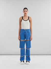 5-pocket jeans made from coated and stonewashed organic cotton denim. Boyfriend fit with straight leg, slashed with multiple horizontal cuts on the front and back. Leather patch with red Marni print on the back waist. Made in Italy MODEL PAJD0520S0USCW91BDB44 FIT The model is 5' 11''. The model is wearing size 40 IT. COMPOSITION Primary Fabric: 100% Cotton Woven - Pocket Lining: 65% Polyester Woven 35% Cotton Woven - Application: 100% Calf Leather