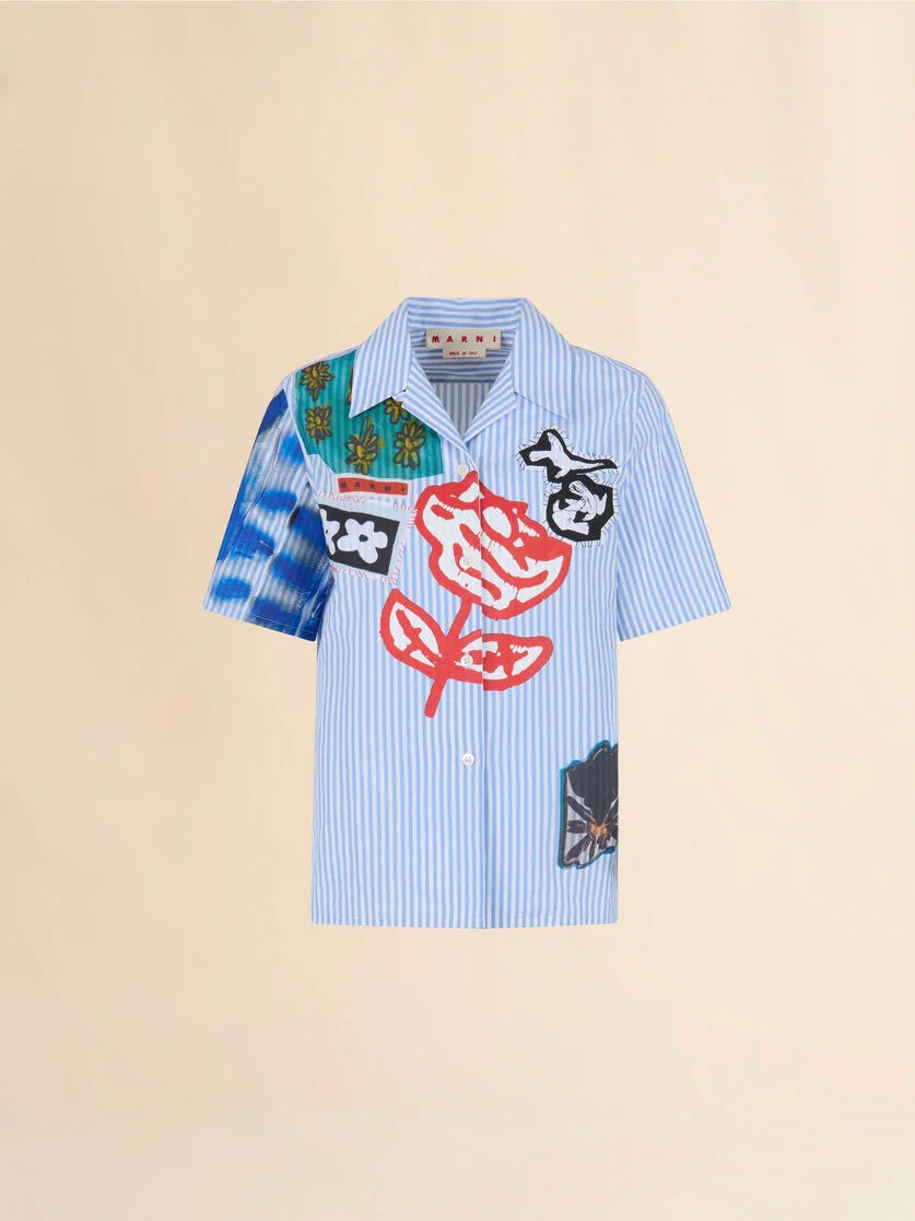 Striped cotton poplin bowling shirt, featuring prints and patches that embody creativity and individuality. Hand-embroidered Marni Mending. Boxy silhouette with short sleeves and Cuban collar. Part of the Artists’ Capsule Collection: an exclusive collab between Creative Director Francesco Risso and artists Soldier Boyfriend and Olaolu Slawn. Made in Italy MODEL CAMA0628SXUSCY28STB50