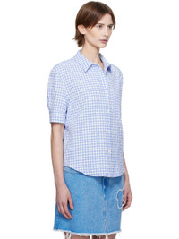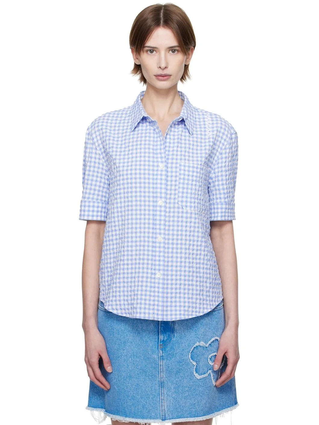 Nylon- and cotton-blend seersucker shirt. Check pattern throughout. · Spread collar · Button closure · Patch pocket · Shirttail hem · Hand-embroidered logo at shoulder · Puff sleeves · Pleated single-button cuffs · Box pleat at back yoke Supplier color: Light blue 51% polyamide, 49% cotton. Made in Romania 251379F109002