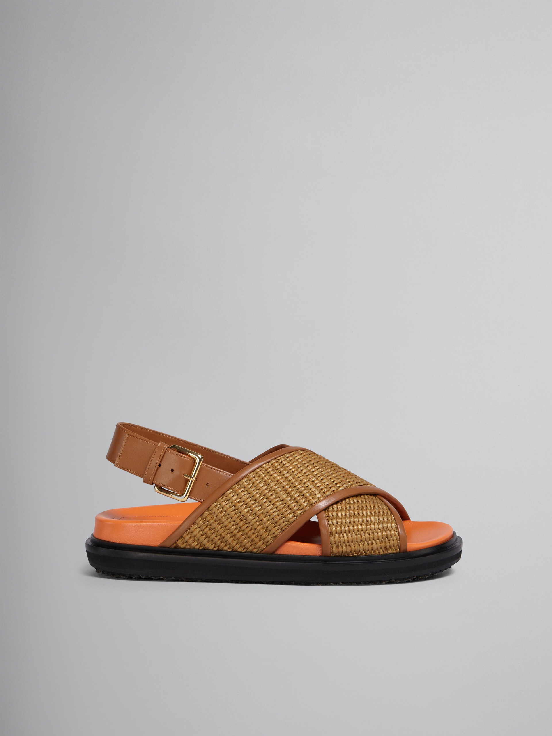 Iconic raffia and leather criss-cross fussbett sandal. Leather back strap. Gold metal buckle. Contrast-coloured anatomical insole. Micro rubber midsole. Rubber and jute outsole. Made in Italy. DETAILS FIT Fits true to size. COMPOSITION Upper: 52% Cotton 48% Polyamide-Nylon - Contrast: 100% Calf Leather - Lining: 100% Calf Leather - Inside: 100% Ovine Leather - Sole: 100% Rubber