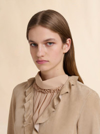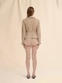 Soft suede jacket with robe-style wrap-around tie closure. Detailed with ruffle trims. Embossed Marni logo patch on the back neck. Unlined. Made in Italy MODEL GIMX0306A0ULA76100W32 COMPOSITION Leather: 100% Ovine Leather - Application: 100% Lamb Leather