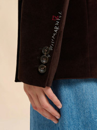 Double-breasted blazer made from plush cotton velvet. Regular fit with four-button fastening, welt chest pocket and two flap pockets. Features a pony hair leather profile on the back of the neck and lapel. Detailed with new Marni Mending on the left sleeve cuff. Fully lined. Made in Italy MODEL GIMA0311NSUTC55000M69