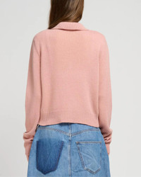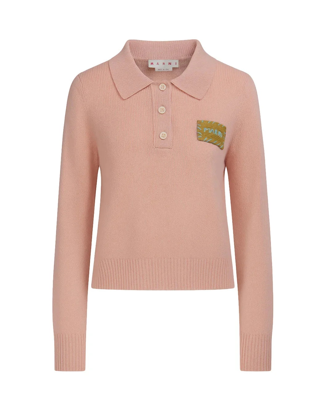 The Button Logo-Applique Polo Top in Cashmere in the color Pink Gummy by Marni is a long-sleeve polo top that features a button front, collared neckline, ribbed hem and cuffs, and an applique Marni logo. Your perfect fall transition sweater top. - Material: 100% Cashmere - Details: Button front. - Fit: True to size. Relaxed fit. - Style it with: Denim or tuck into a trouser. - Made in Italy - #POMD0060A0