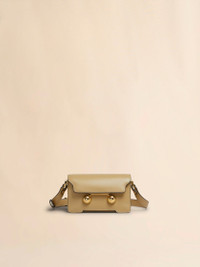 Trunkaroo rectangular mini shoulder bag crafted from calfskin leather. Front flap with magnetic closure, featuring engraved Marni lettering and oversized stud details. Contoured base on the front and back. One compartment with inside pocket. Lined in nappa leather. Detachable and adjustable buckled shoulder strap: can also be worn as a clutch. Made in Italy MODEL SBMP0193U0P694800W60 COMPOSITION Body: 100% Calf Leather - Lining: 100% Ovine Leather - Metallic Parts: 100% Brass - Metallic Parts: 100% Steel